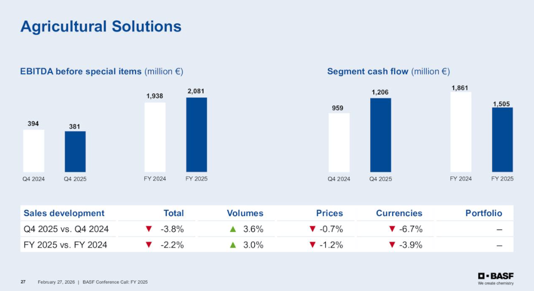 EBITDA before special items was €2.08 billion, up 7.4% YoY (from €1.9 billion). The EBITDA margin improved to 21.7% from 19.8% in 2024. The improvement was from reducing manufacturing costs and the commercial launch of glufosinate-P-ammonium in North America. One notable special item was the ongoing ERP system conversion costs, which ran €156 million in EBITDA. Notably, cash flow was down 19% to €1.5 billion. Despite higher EBITDA, cash flow was challenged by an inventory buildup in 2025, compared to a significant inventory reduction in the prior year. Notably, EBITDA before special items for 2026 is expected to be slightly lower than 2025.