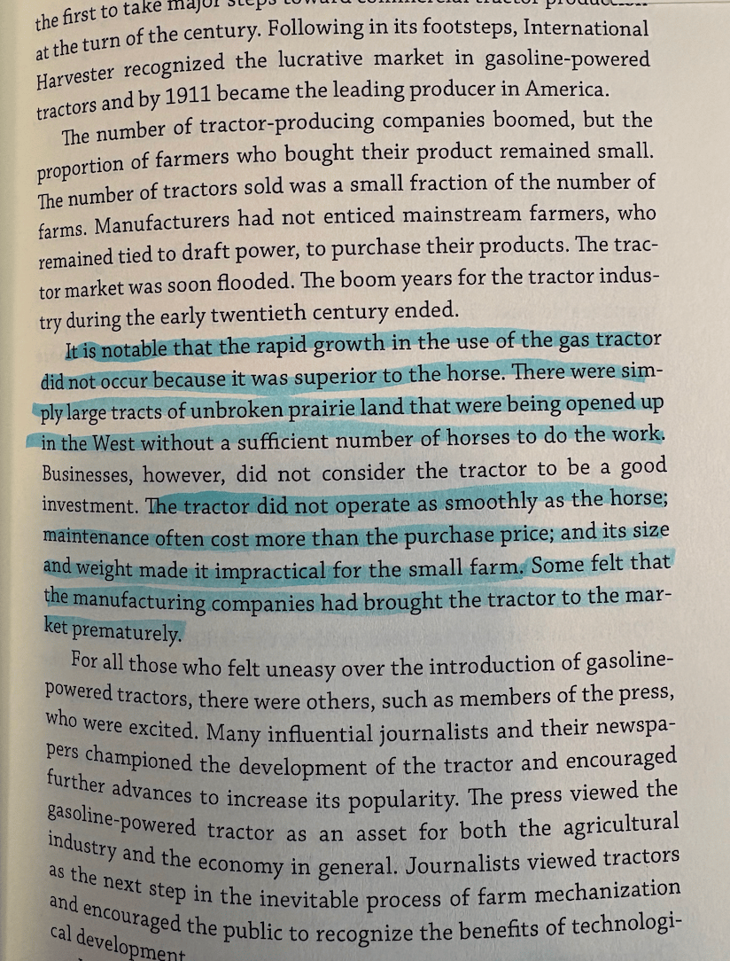 “It is notable that the rapid growth in the use of the gas tractor did not occur because it was superior to the horse. There were simply large tracts of unbroken prairie land that were being opened up in the West without a sufficient number of horses to do the work. Businesses, however, did not consider the tractor to be a good investment. The tractor did not operate as smoothly as the horse; maintenance often cost more than the purchase price; and its size and weight made it impractical for the small farm. Some felt that the manufacturing companies had brought the tractor to the market prematurely.”