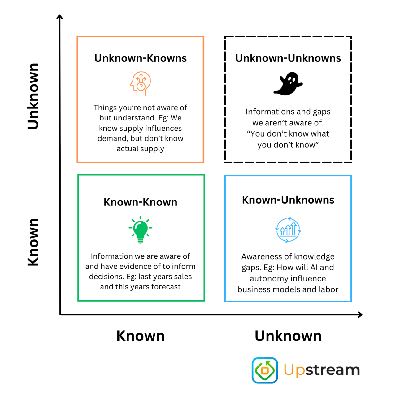 Originally popularized by Donald Rumsfeld and later expanded in risk and strategy circles, the “Knowns and Unknowns” 2x2 framework helps organizations understand what they know, what they don’t know, and the implications of each.