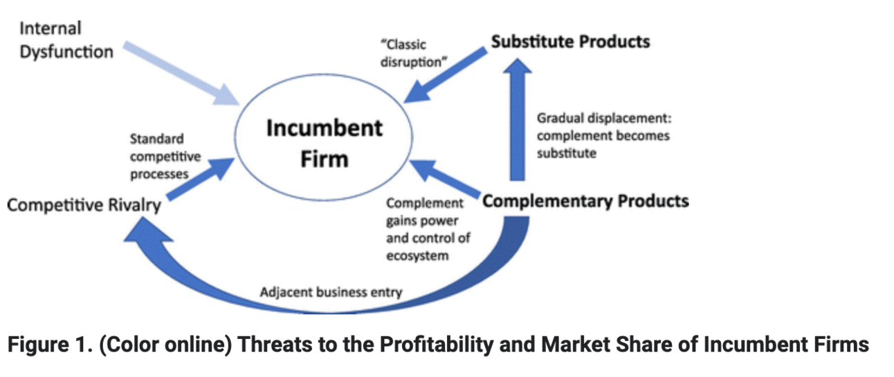 Disruption through complements occurs when the value of a core product is undermined not by a direct competitor, but by improvements in complementary innovations— products or services that must work together with the core product to create value.