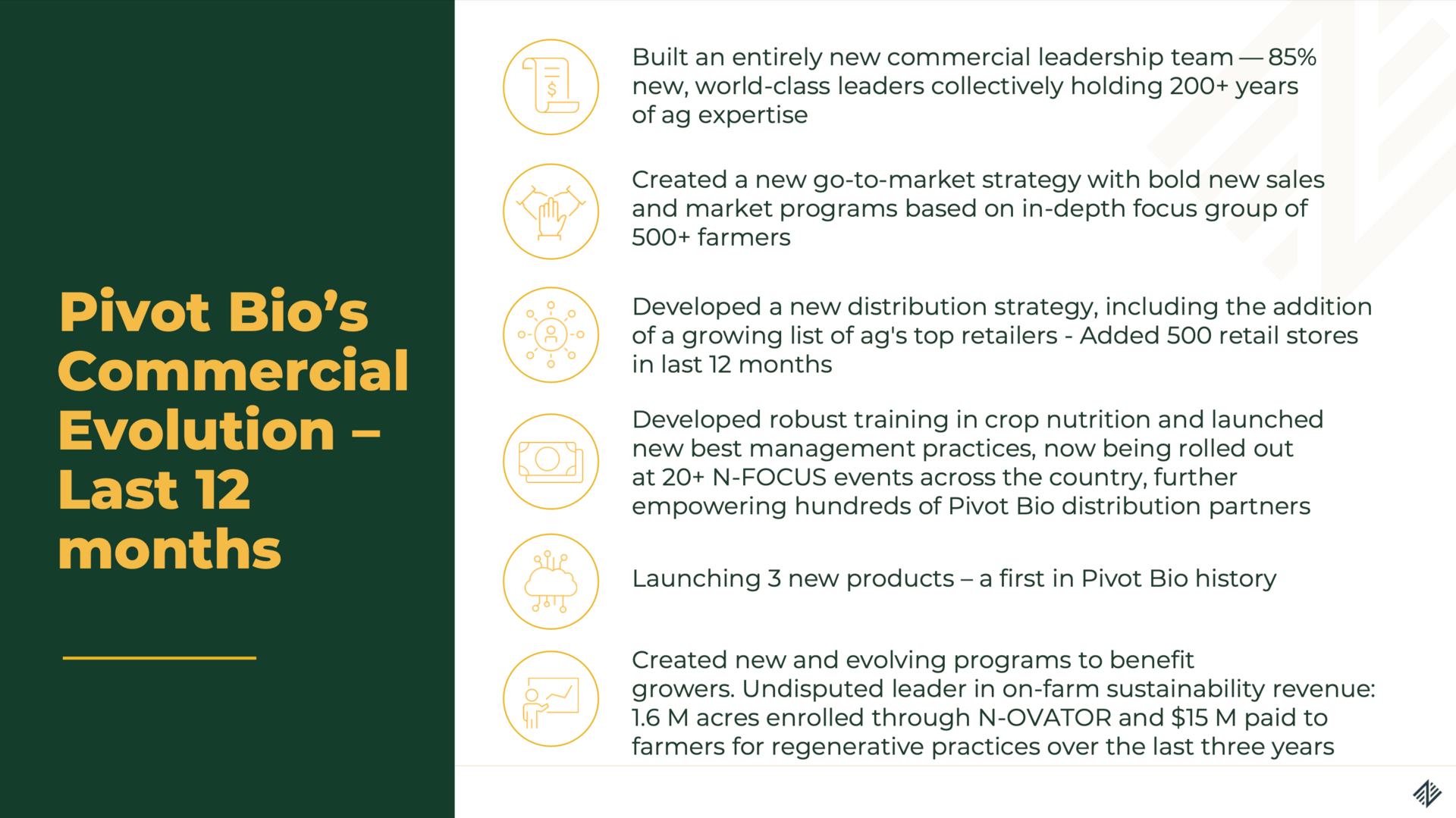 By 2022, Pivot surpassed $50 million in revenue and had products on over 3 million acres plus announcing an on-seed product.