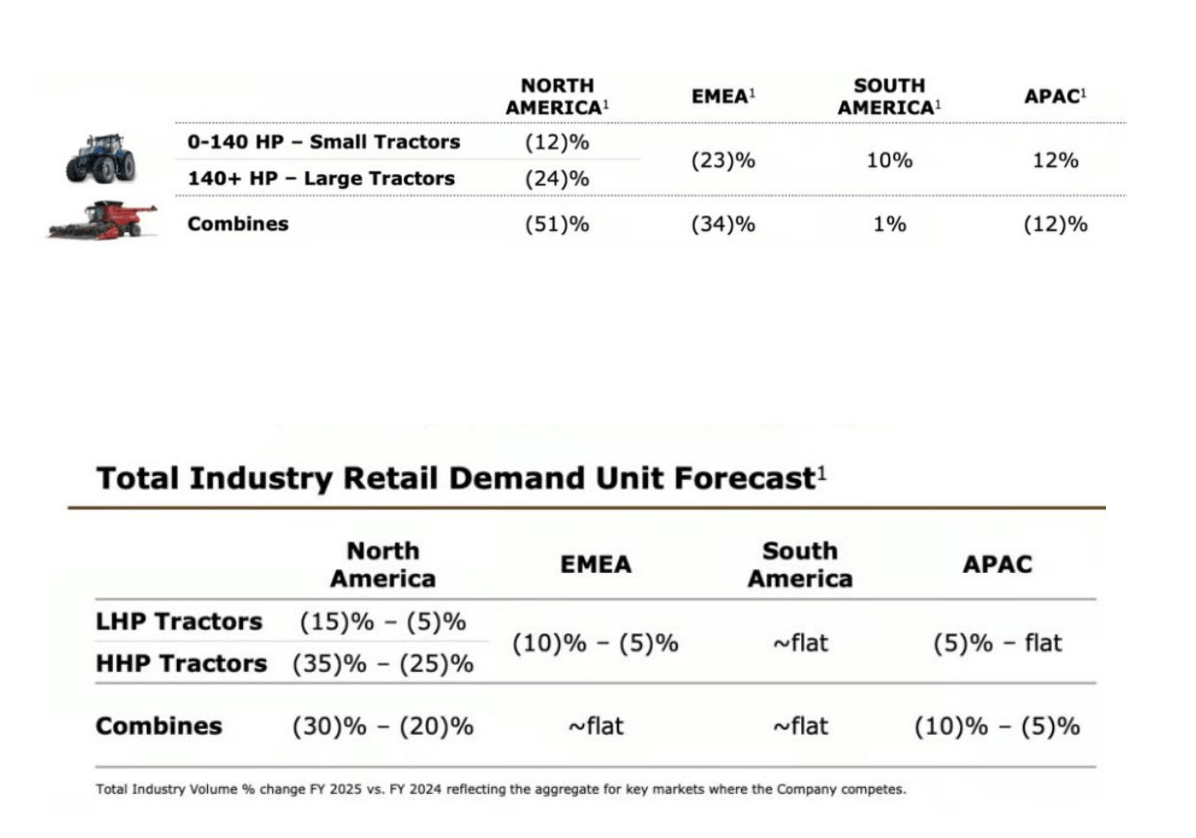 Equipment markets remain volatile due to high inventory levels, tariffs, lower farmer sentiment, and declining combine and high-horsepower tractor demand—particularly acute in North America where combine unit sales fell 46%.
