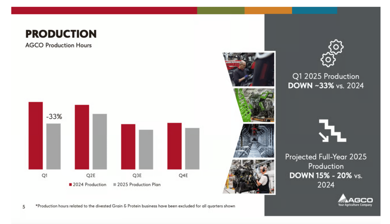 AGCO cut production hours 33% YoY in Q1 to pull down channel inventory with FY 2025 projected to be down 15%-20%: