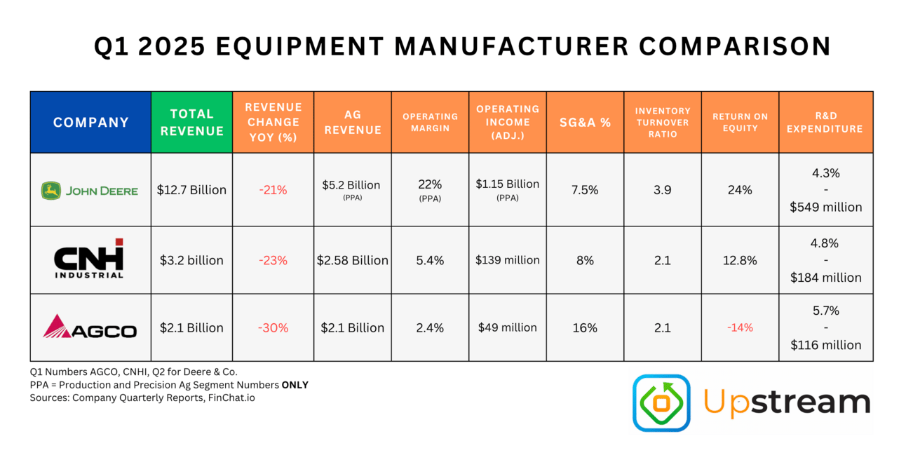 John Deere’s Production and Precision Ag revenue fell 21% YoY to $5.2 billion, with operating profit down 30% to $1.15 billion and margins dropping from 25.1% to 22.0%.