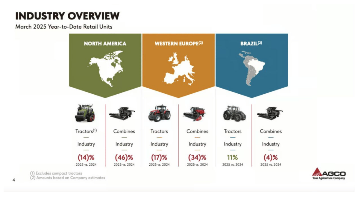 AGCO had a 30% YoY decline for Q1 2025, with sales totaling $2.1 billion. North America led the downturn with a 34% drop, while company-wide operating income fell over 80%, resulting in tight operating margins of just 2.4%.