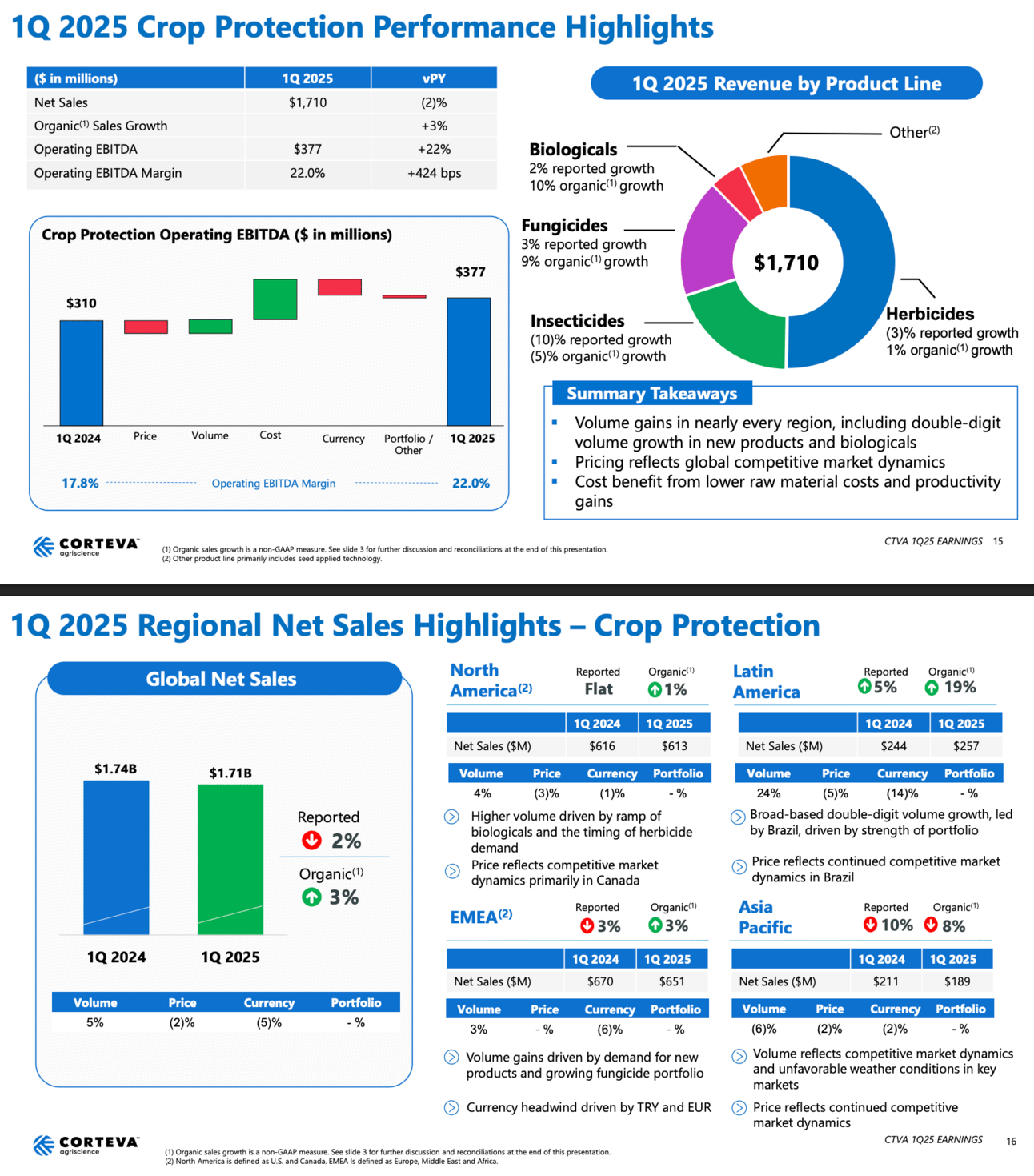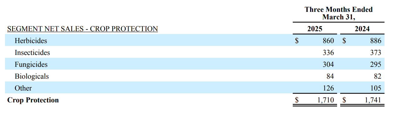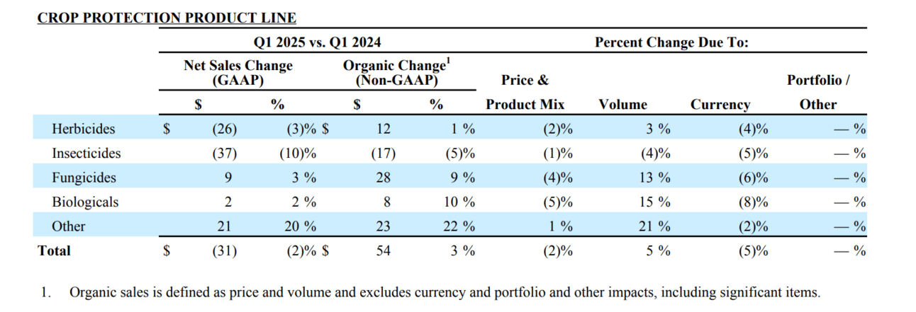 Crop Protection sales were $1.71B (↓2%, but +3% organic), EBITDA up 22%. Pricing pressure remains from generics.