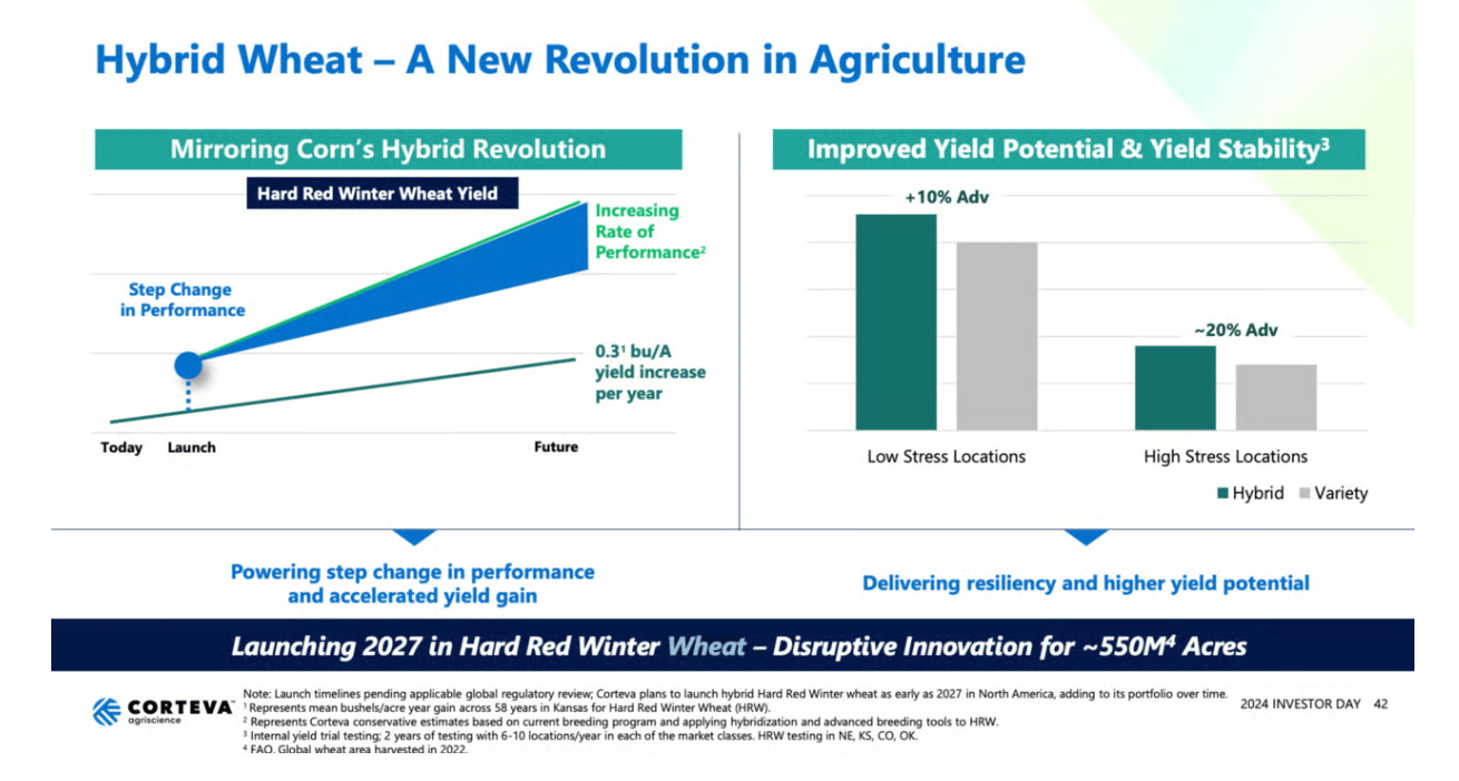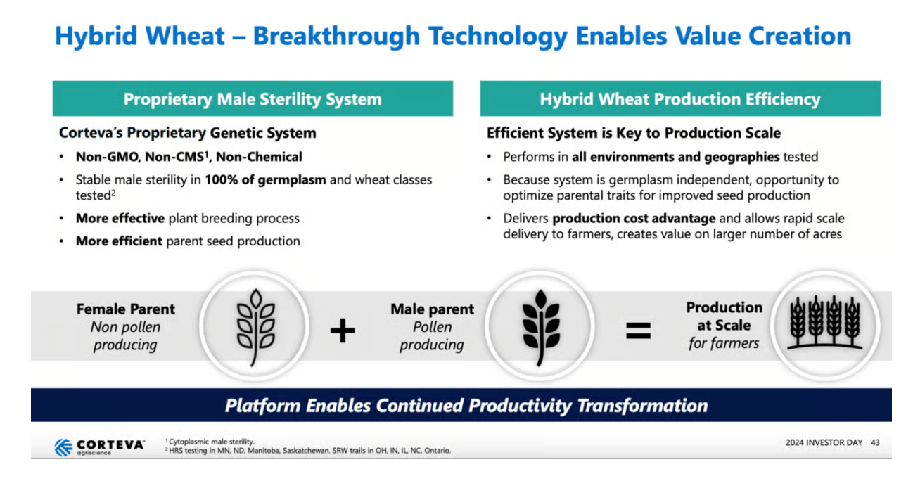 In November 2024 Corteva announced a breakthrough that would enable them to scaleably and cost effectively commercialize hybrid wheat in North America.