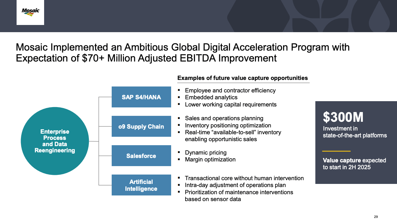 The early benefits are showing—Mosaic anticipates $70 million in annualized savings from technology-driven efficiencies by year-end.