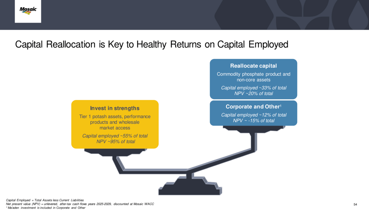 Note that 55% of their capital delivered 95% of the returns according to their calculations, primarily in potash, performance products (eg: MicroEssentials), and wholesale— an intense power law that means 45% of their capital deployed returned a mere 5% of NPV. According to their financial results, they had just a 1.6% return on invested capital (ROIC) in 2024, a number no one at Mosaic, or holding shares wants to see.