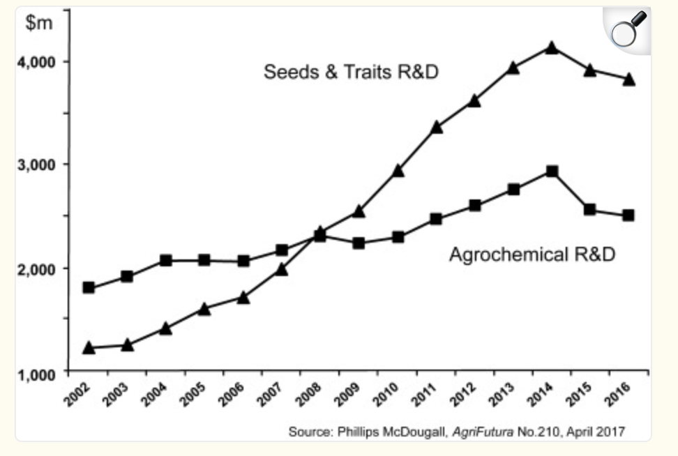 However, not all of those dollars are being allocated to Crop Protection. Referencing old data from Phillips McDougall, a higher percentage of spend goes to seed and trait R&D: