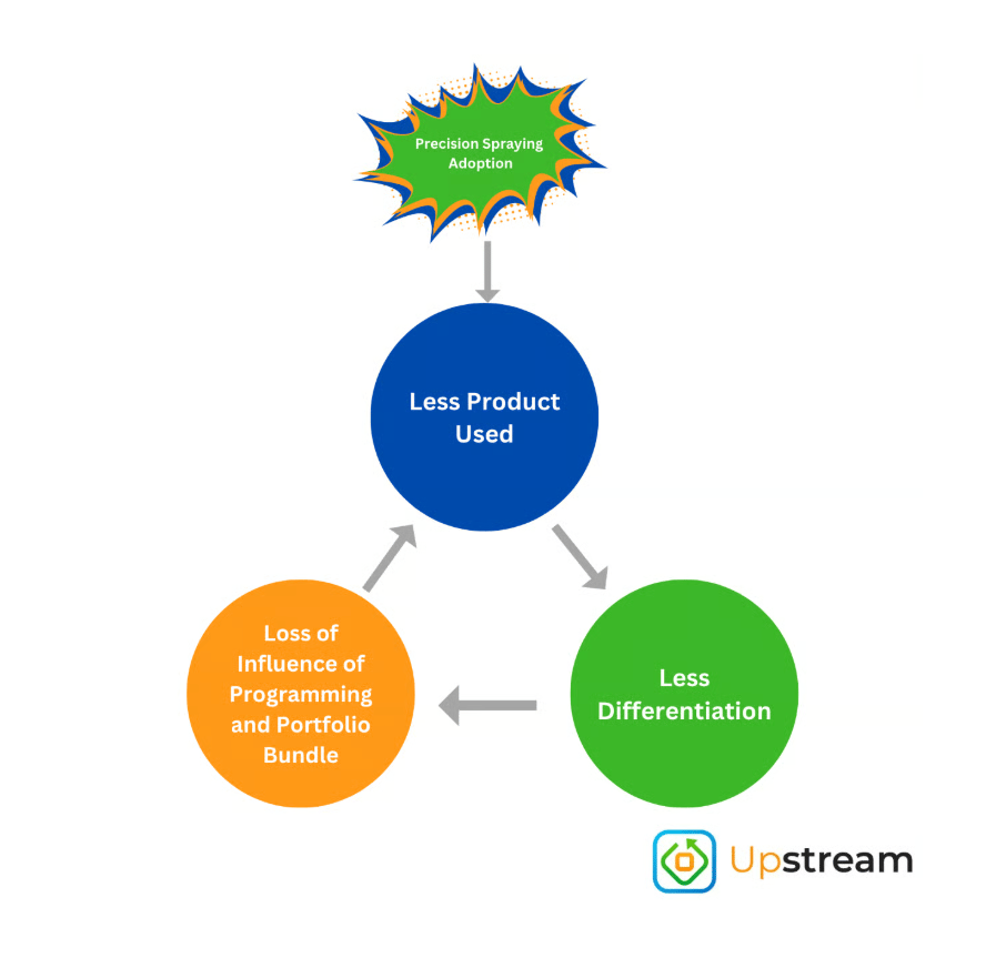 When a multi-spray tank system can identify weeds and selectively apply product, the value of traditional herbicide differentiators (tank mixability, crop safety, relative efficacy) diminishes. Classic disruption through complements.