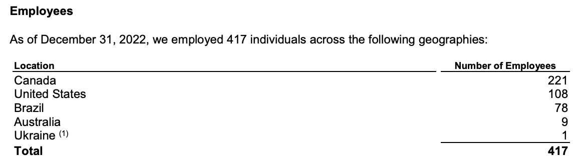 Our revenue mix by geography for the year ended December 31, 2022 is as follows: 35% Canada, 44% United States, 17% Brazil, 4% other.