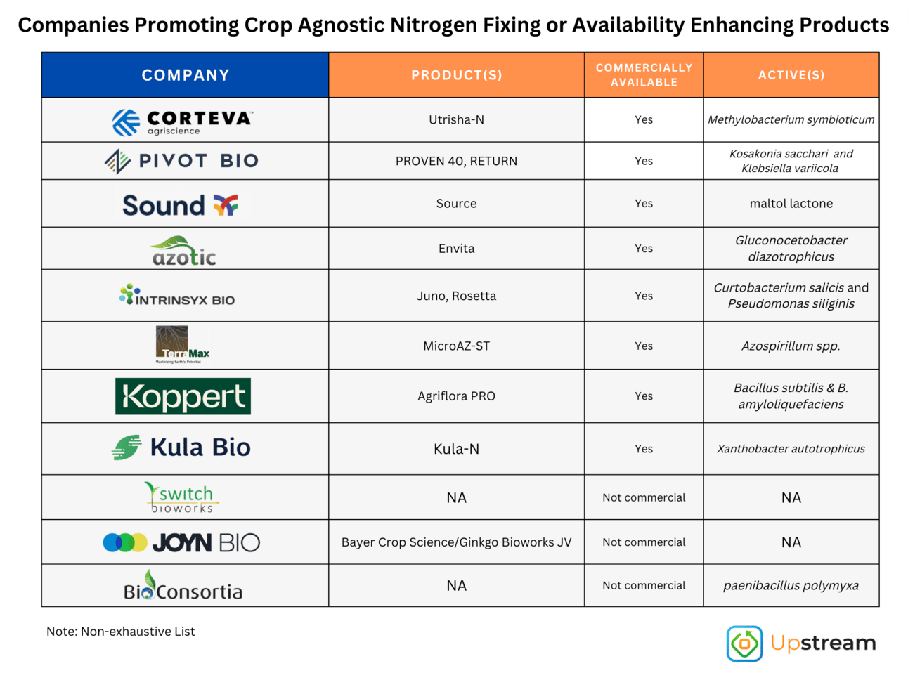 Corteva Agriscience purchased biological company Symborg in 2022 (for an undisclosed amount), a company whose most prominent product has the active ingredient Methylobacterium symbioticum, a nitrogen-fixing bacteria.
