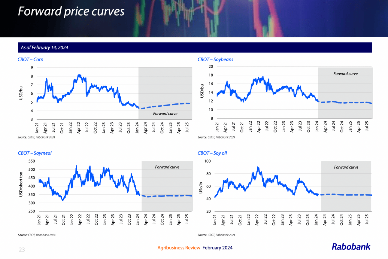 Prices for commodities like corn and soybean are forecast to be lower than the past few years: