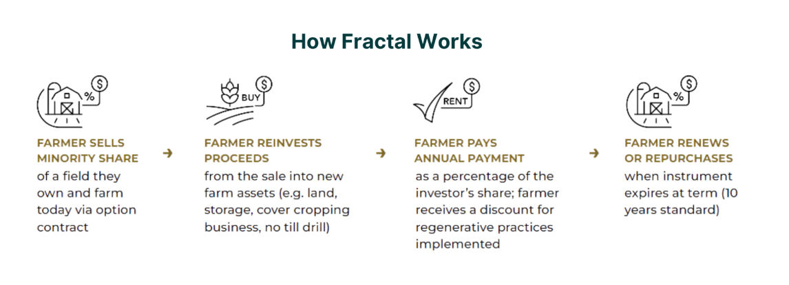 Unlike traditional investors that compete with farmers for land and lease it back to them, Fractal invests alongside farmers by taking passive, minority stakes in land farmers' own. Farmers receive needed capital to expand their operations, while investors access high quality farmland managed and owned by farmers to drive higher returns.