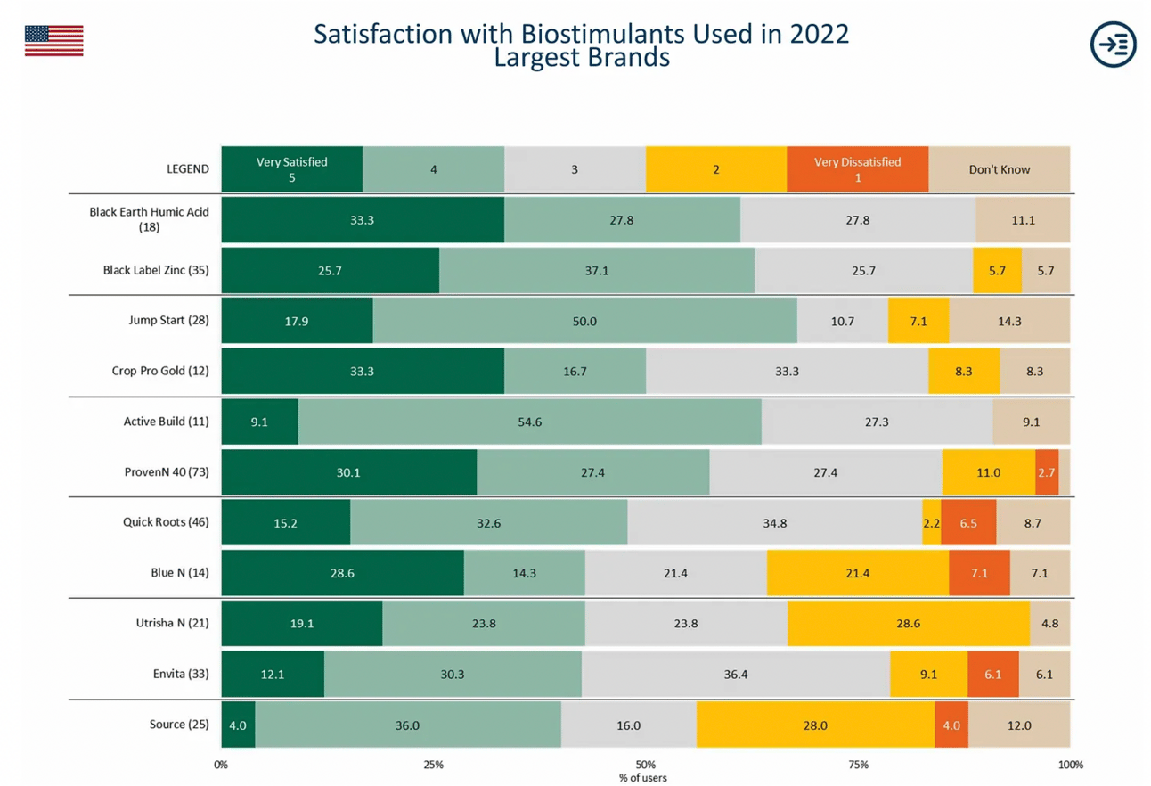Pivot’s flagship PROVEN40 liquid-in-furrow product has the highest satisfaction of any crop-agnostic nitrogen fixing product on the market, with about 58% “satisfied or very satisfied” and another 28% in the middle. Only about 13% were dissatisfied.