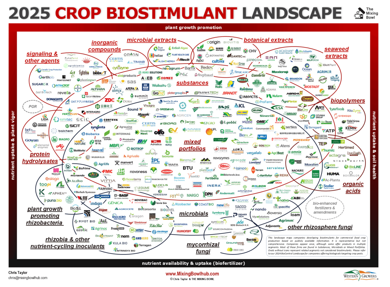 Chris Taylor and The Mixing Bowl continue to do a fantastic job of building landscape maps for various agtech segments— this week releasing the 2025 Crop Biostimulant landscape that includes more than 350 companies: