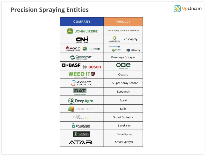 Some providers of online precision spraying technology for row crops covered in the report.
