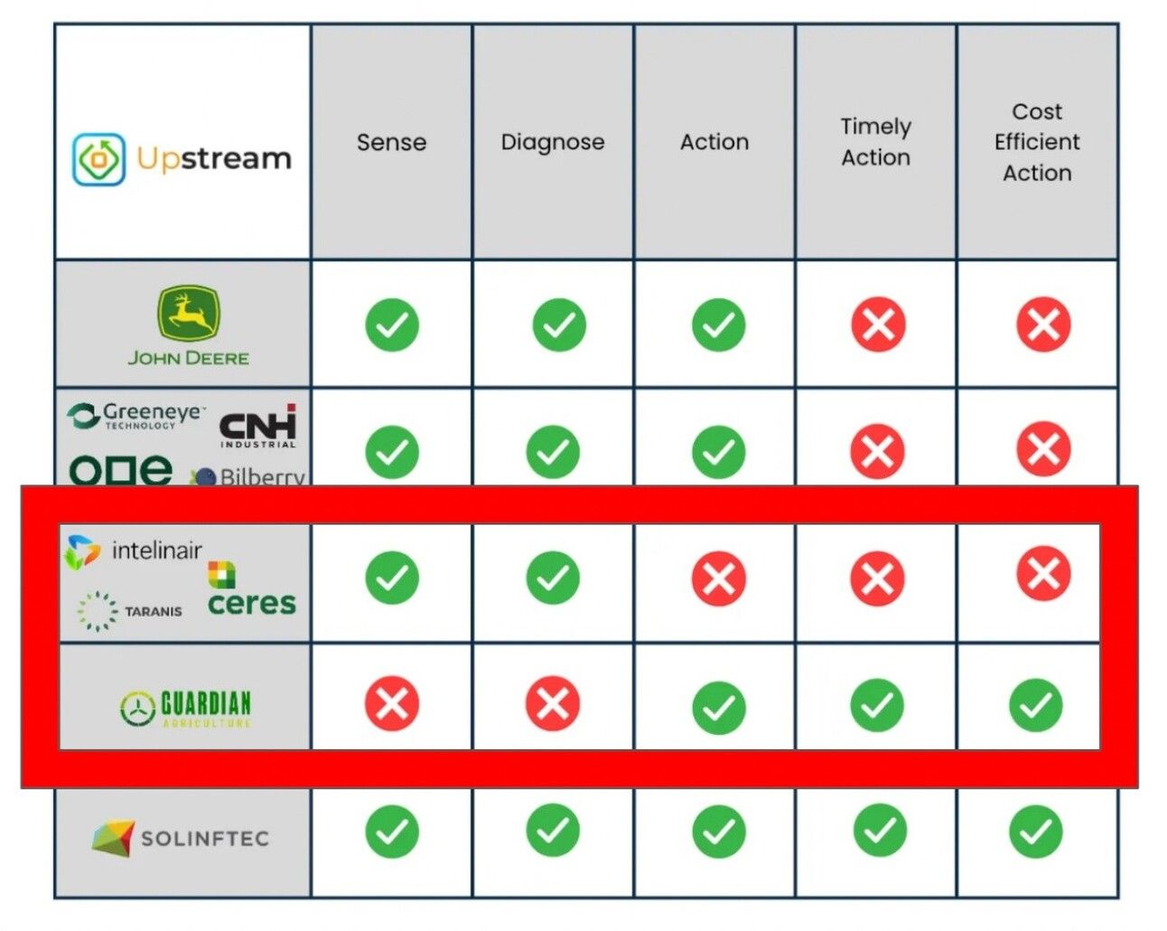 I created a chart illustrating where certain companies fall on the continuum of sensing and action and it becomes notable where opportunities for connection between aerial analytics companies with drone spray applications: