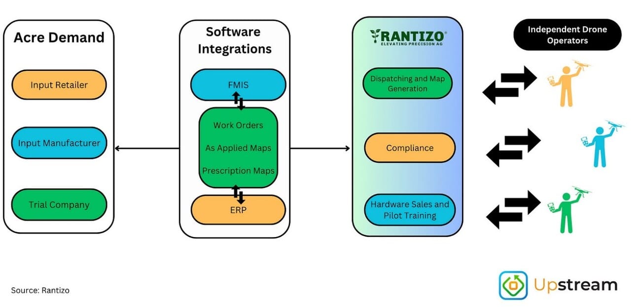 Rantizo enables the networked marketplace itself by first re-selling drones, support, software and training to ag retailers and spray drone operators and by flying contracted acres for spraying services. Sometimes, these are independent individuals or companies operating the drones themselves; sometimes, it is a Rantizo-owned operation, or sometimes it is ag retailers themselves that spent capital on equipping themselves and their staff with the ability to fly drones and apply crop inputs.